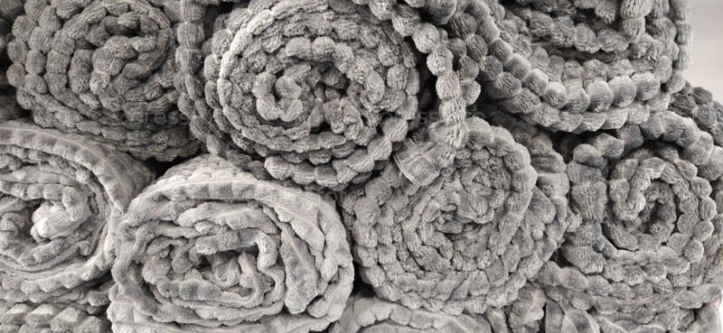 Мягкие пушистые серые коврики, сложенные в мотки и жгуты. Ассортимент светло-серых покрывал на полке магазина. Одеяла красиво разложены для продажи. Синтетическая ворсистая ткань