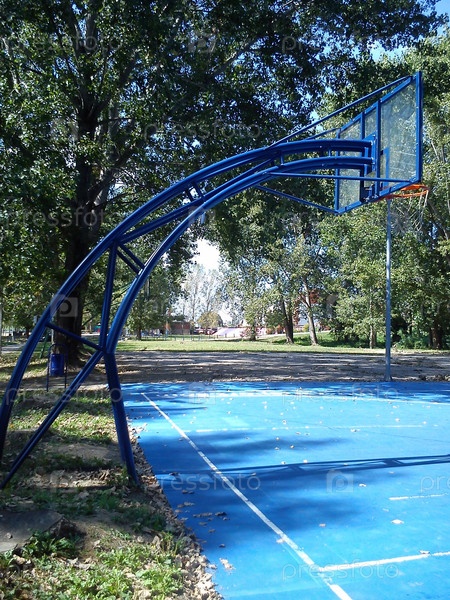 Баскетбольная спортивная площадка без спортсменов и людей. Баскетбольная вышка с корзиной и скамейкой окрашена в синий цвет. Лето, деревья с зеленой листвой