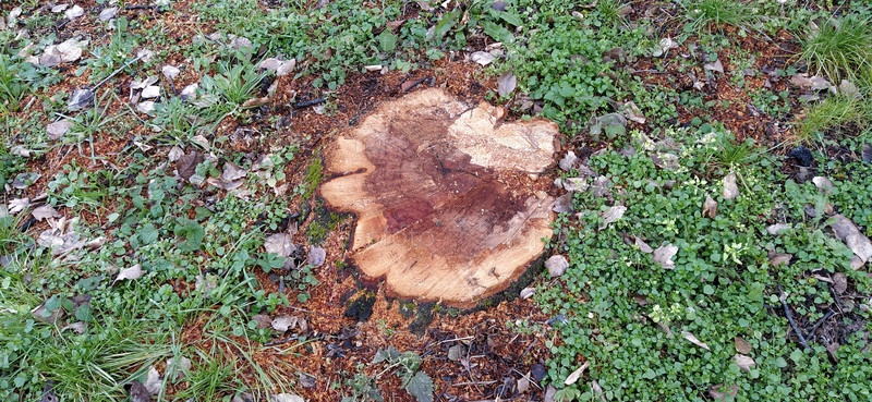 Пень со свежим порезом. Дерево срублено под корень. Крупный план. Годовые кольца на горизонтальной деревянной поверхности. Темная, гнилая середина ствола дерева