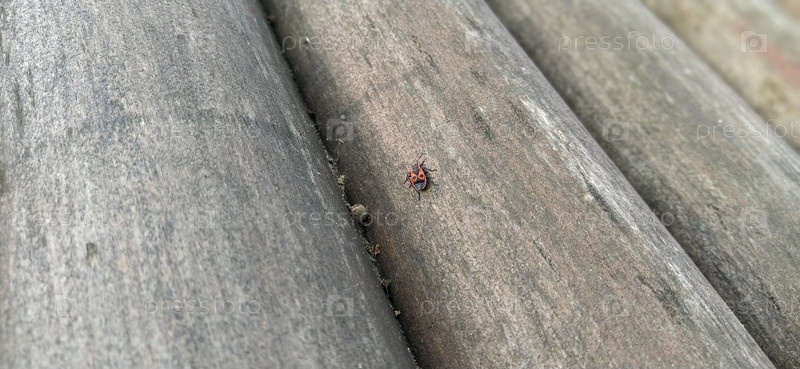 Жук с красно-черной спиной и длинными усами ползает по деревянной поверхности. Насекомое на старом круглом бревне. Мокрое серое дерево. Крупный план