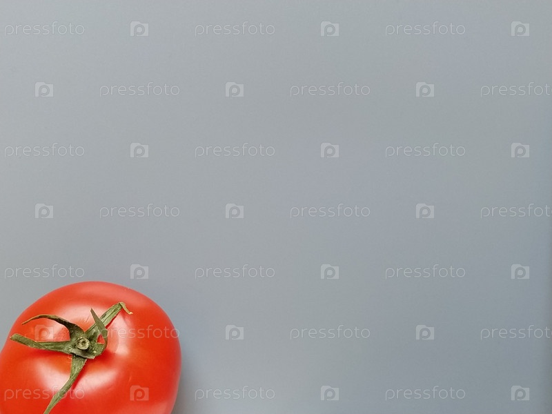 Красивый вкусный помидор с зелеными листьями на сером фоне. Освещение сверху. Овощ расположен в левом нижнем углу изображения. Ярко-красный цвет спелых плодов. Блестящая кожура свежих продуктов