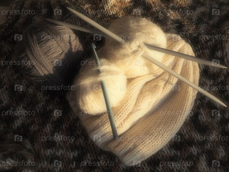 Клубки пряжи, вязаная одежда, спицы и крючки. Вязание как хобби. Коричневые, бежевые и белые нитки в мотках. Расфокусированное изображение
