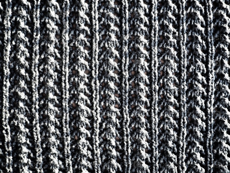 Вязаный узор из шерстяной пряжи. Пышная машинная или ручная вязка. Теплый гардероб на осенне-зимний период. Вязать лицевыми, изнаночными петлями. Способ вязания – волнистая резинка. Черно-белое монохромное изображение