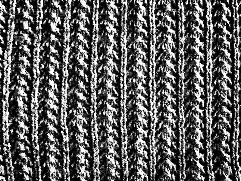 Вязаный узор из шерстяной пряжи. Пышная машинная или ручная вязка. Теплый гардероб на осенне-зимний период. Вязать лицевыми, изнаночными петлями. Способ вязания – волнистая резинка. Черно-белое монохромное изображение