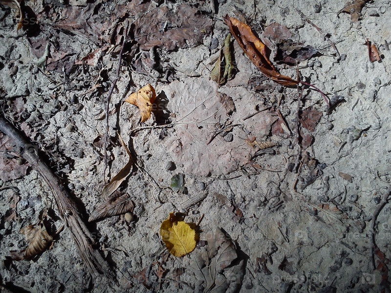 Легкая глинистая почва. Лесная земля. Трещины от засухи на почве. Желто-серые осенние опавшие листья. Семена деревьев, веточки и палочки лежат рядом с листьями. Естественный солнечный свет тусклый