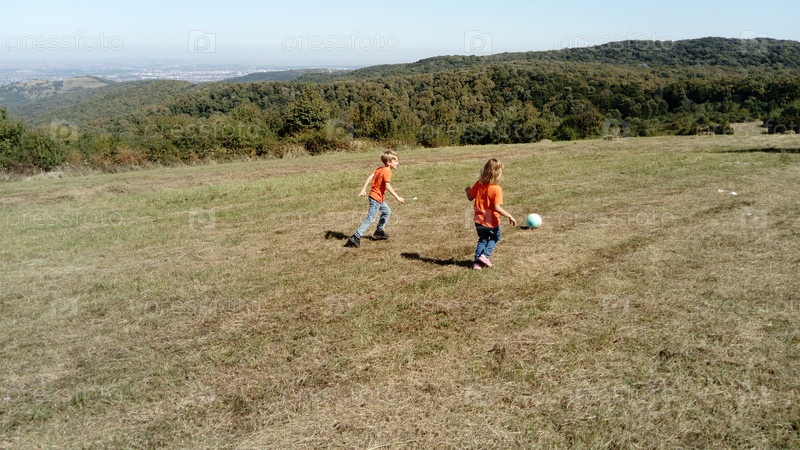Мальчик и девочка со светлыми волосами, одетые в оранжевые футболки и классические джинсы, играют в мяч на горном лугу. Ранняя теплая осень. На заднем плане горизонт и растительность,