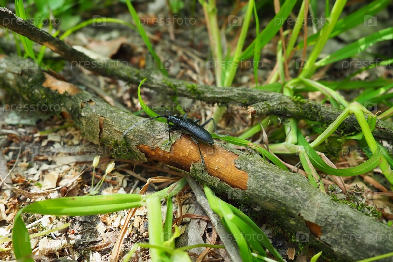 Cerambyx cerdo, большой жук-козерог или cerambyx longicorn, Cerambycidae. Он имеет удлиненное, крепкое тело и длинные усы. Самка. Большой черный жук с длинными усами. Фрушка Гора, Сербия