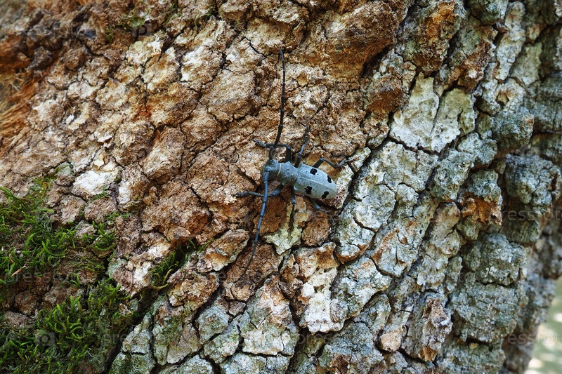 Morimus funereus вид жука семейства Cerambycidae или подвид Morimus asper. Красивый толстый серый жук с длинными усами на корице коричневого дуба. Фрушка Гора, Сербия, Балканы