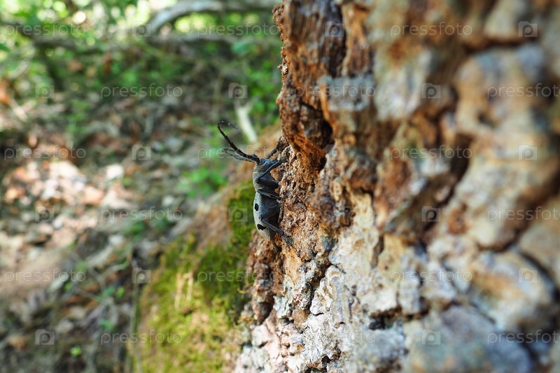 Morimus funereus вид жука семейства Cerambycidae или подвид Morimus asper. Красивый толстый серый жук с длинными усами на корице коричневого дуба. Фрушка Гора, Сербия, Балканы