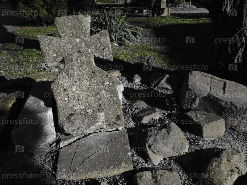 Крест. Надгробие на католическом христианском кладбище. Покосившийся каменный памятник. Неизвестная могила в лучах низкого вечернего солнца. Тема Хэллоуина