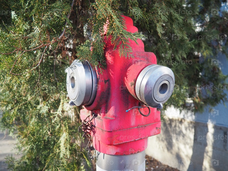 Промышленный пожарный гидрант. Наружное оборудование для тушения пожаров в городских условиях. Металл покрашен в цвет карс. Два крана для пожарных рукавов. На заднем плане листья туи