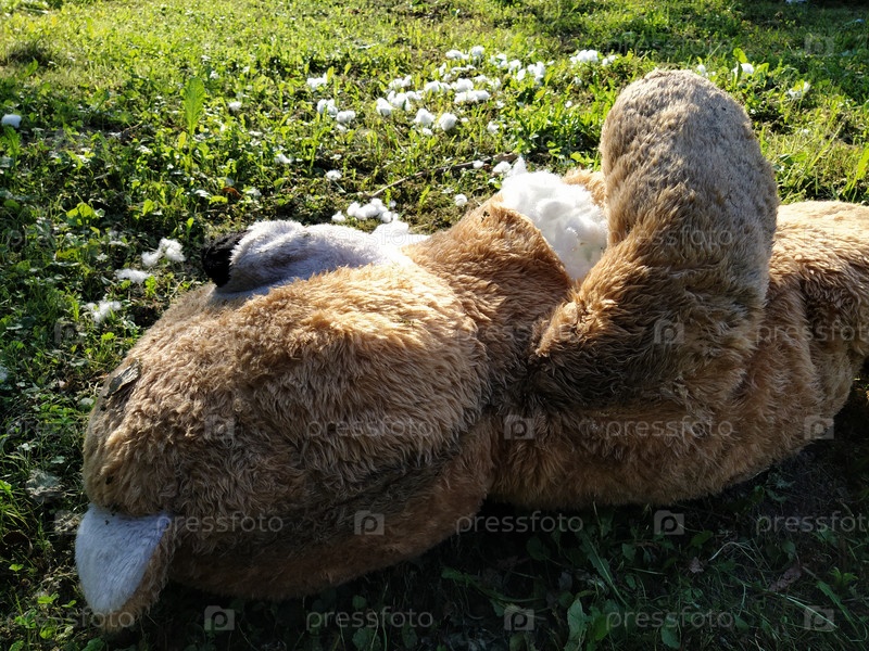 Ненужная забытая игрушка на траве. На земле лежит разорванный плюшевый мишка. Концепция насилия и забывчивости. Из груди медведя видна белая вата. Наполнитель вокруг игрушки