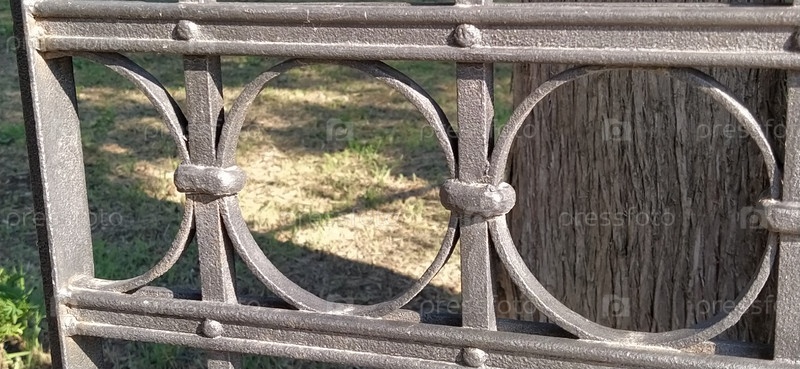 Кованый металлический забор. Металлический предмет. Красивые изогнутые линии с загнутыми краями. Работа по стали