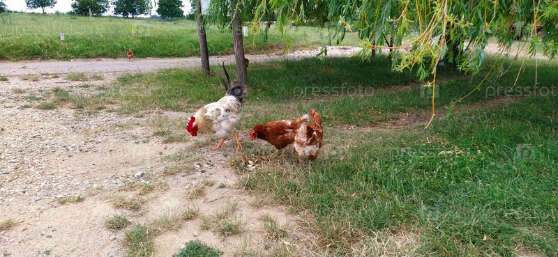 Курица свободного выгула на традиционной птицефабрике. Три петуха ищут еду в траве. Одна белая курица и две курицы с коричневыми перьями. Три птицы