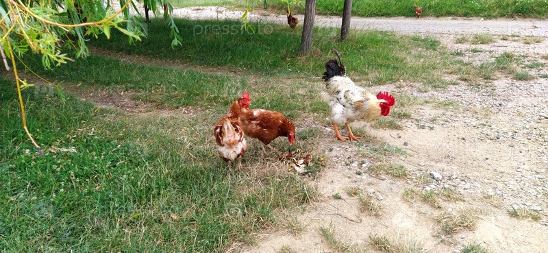 Курица свободного выгула на традиционной птицефабрике. Три петуха ищут еду в траве. Одна белая курица и две курицы с коричневыми перьями. Три птицы