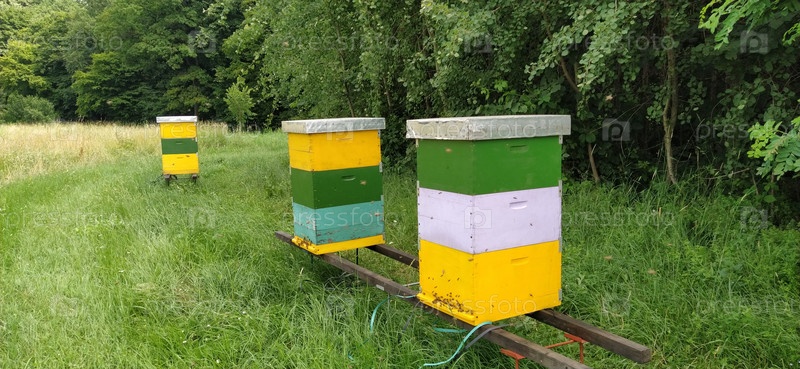 Ульи с пчелами. Пчеловодство. Ульи, стоящие в природе, окрашены в желтый, зеленый и синий цвета. Растения – медоносы. Пасека в Сербии. Пчелы собирают цветочный нектар и превращают его в мед
