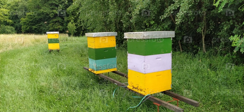 Ульи с пчелами. Пчеловодство. Ульи, стоящие в природе, окрашены в желтый, зеленый и синий цвета. Растения – медоносы. Пасека в Сербии. Пчелы собирают цветочный нектар и превращают его в мед