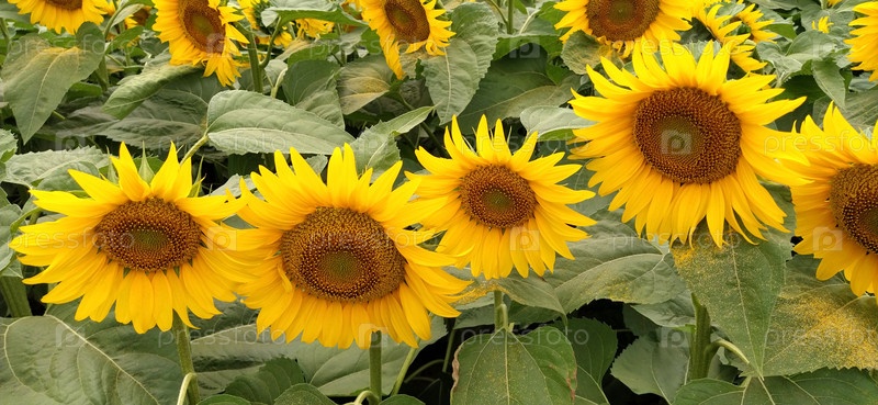 Поле цветущих подсолнухов. Красивые желтые крупные цветы с темной серединкой. Семена подсолнечника. Сельскохозяйственная концепция. Большие зеленые листья с опавшей на них желтой пыльцой. Крупным планом