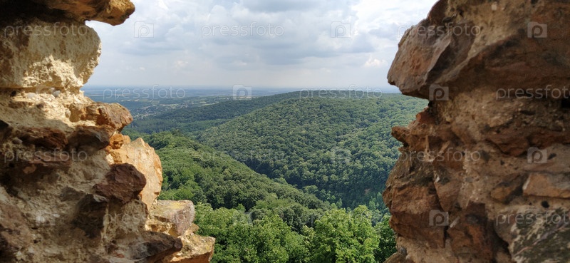 Руины старой крепости во Врднике, Сремска-Митровица, Воеводина, Сербия. Древние каменные стены с горными хребтами на заднем плане. Туристические достопримечательности. Амбразура или окно для наблюдения и обороны