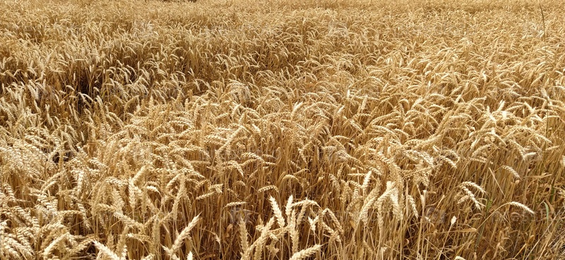Пшеничное поле. Семена золотой пшеницы крупным планом. Красивая природа. Сельские пейзажи под ярким солнечным светом. Концепция богатого урожая и сельскохозяйственного труда. Зерновые растения на поле