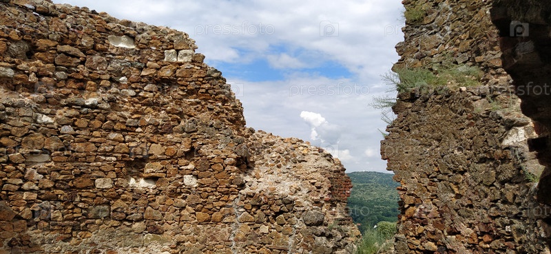 Руины старой крепости во Врднике, Сремска-Митровица, Воеводина, Сербия. Древние каменные стены с горными хребтами на заднем плане. Туристические исторические достопримечательности