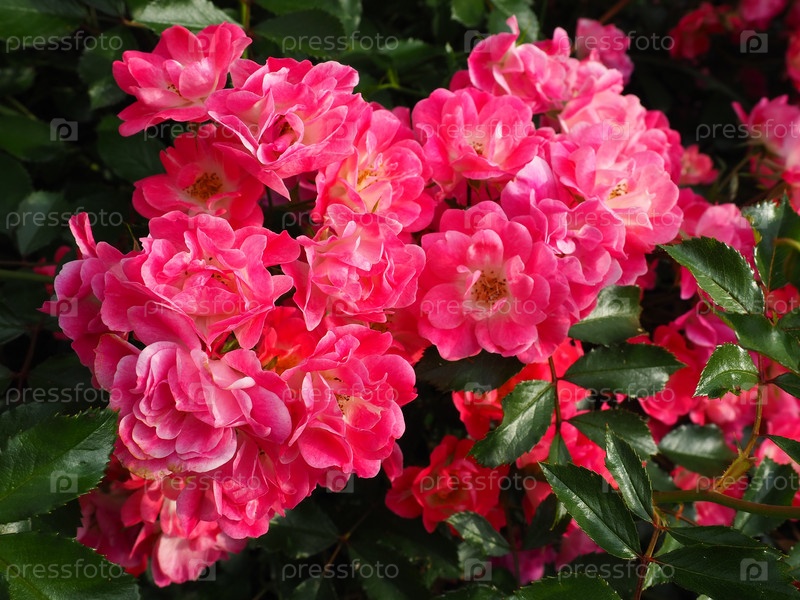 Крупный план куста розовых роз в летнем саду под солнечным светом. Розовые кустовые розы с множеством бутонов, раскрывшимися цветками. Клумба в парке, способ украшения улиц и пейзажей