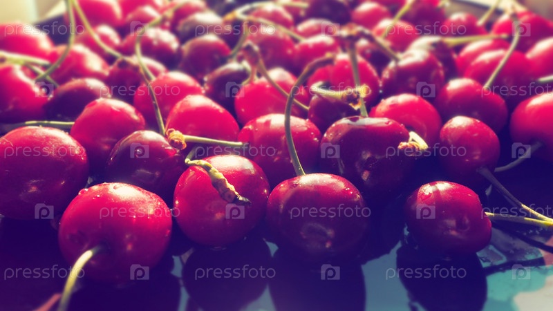 Вишневый фон. Сочная спелая вкусная вишня или черешня крупным планом на темной тарелке и деревянном фоне. Летние фрукты и ягоды. Витаминная диета