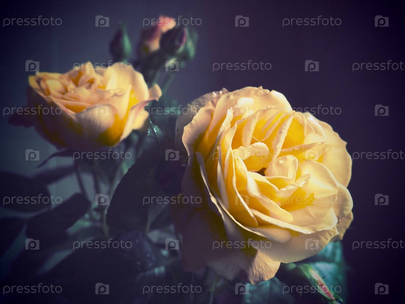 Желтые розы на темном фоне. Красивый букет из 3 роз. Открытка с 8 марта, Днем матери или Днем святого Валентина. Нежные лепестки роз. Темное виньетирование по краям изображения