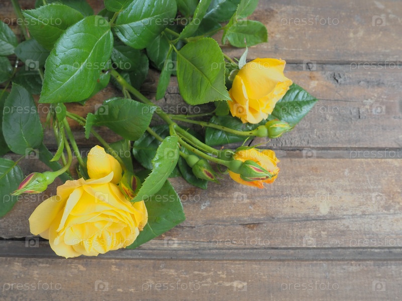Желтые розы на деревянном фоне. Красивый букет из 3 роз на темном деревянном столе. Открытка с 8 марта, Днем матери или Днем святого Валентина