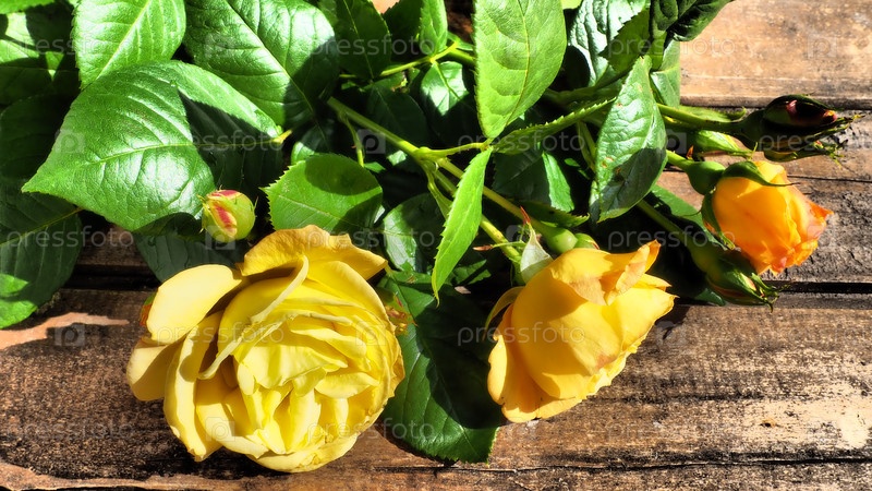 Желтые розы на деревянном фоне. Красивый букет из 3 роз на темном деревянном столе. Открытка с 8 марта, Днем матери или Днем святого Валентина