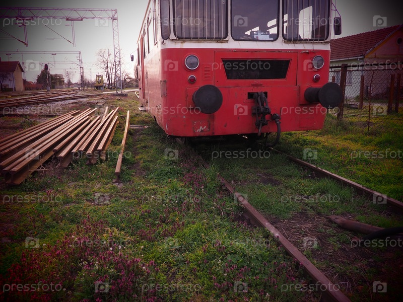 Ретро-вагон красного цвета. Винтажный локомотив производства Югославии. Сремска-Митровица, Сербия. Металлический кузов железнодорожного транспортного средства. Ржавые рельсы. Железнодорожная станция. Пустой вагон в тупике