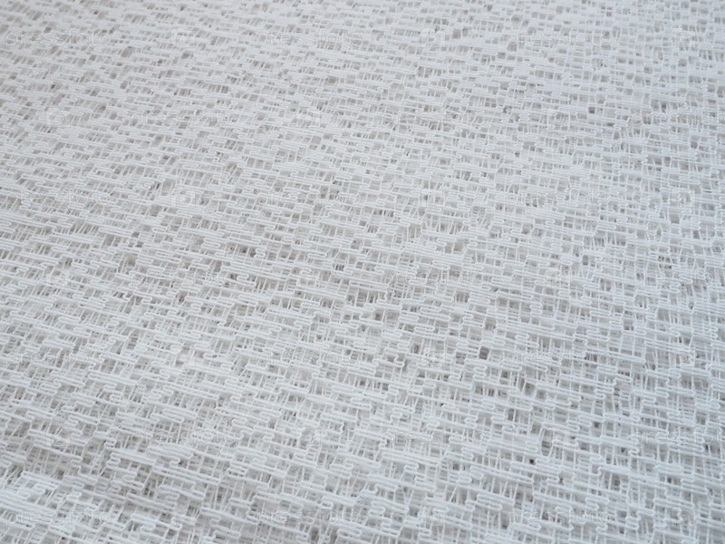 Прозрачный белый тюль в виде сетки. Сетчатая ткань помята или небрежно сложена. Крупный план. Белая вуаль или муслин. Занавес с отверстиями разного размера крупным планом