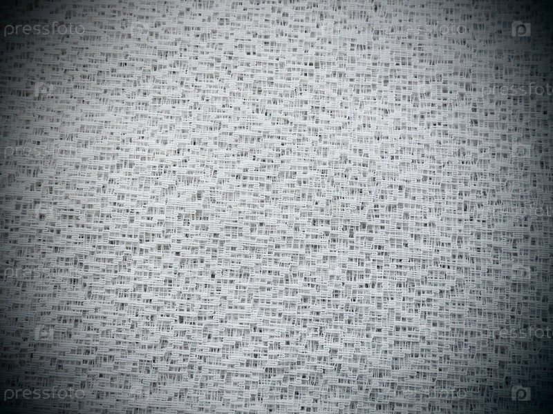 Прозрачный белый тюль в виде сетки. Сетчатая ткань помята или небрежно сложена. Крупный план. Белая вуаль или муслин. Занавес с отверстиями разного размера крупным планом. Темное виньетирование по краям