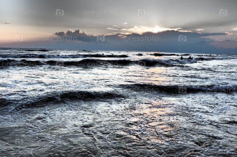 Волны с пеной. Красивый закат. Пенистые волны накатываются на песчаный берег. Витязево, Анапа, Черное море. Туристическая Мекка, курорт. Красочные облака в вечернем небе. Лучи отражаются от воды