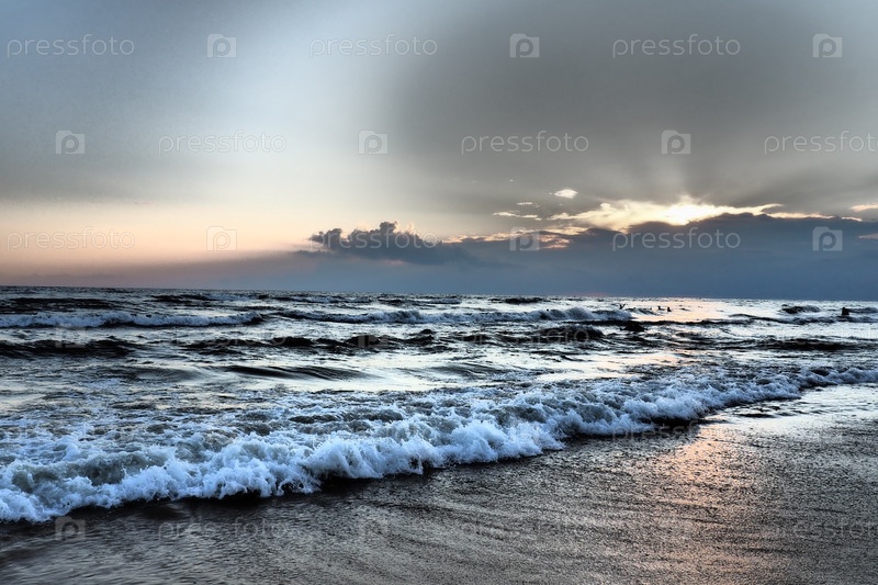 Волны с пеной. Красивый закат. Пенистые волны накатываются на песчаный берег. Витязево, Анапа, Черное море. Туристическая Мекка, курорт. Красочные облака в вечернем небе. Лучи отражаются от воды