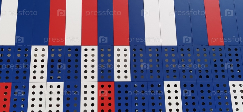 Фасад современного здания. Красные, синие и белые плиты или металлические профили с декоративными отверстиями. Технологические решения в экстерьере. Возведение несущих конструкций под декоративные элементы