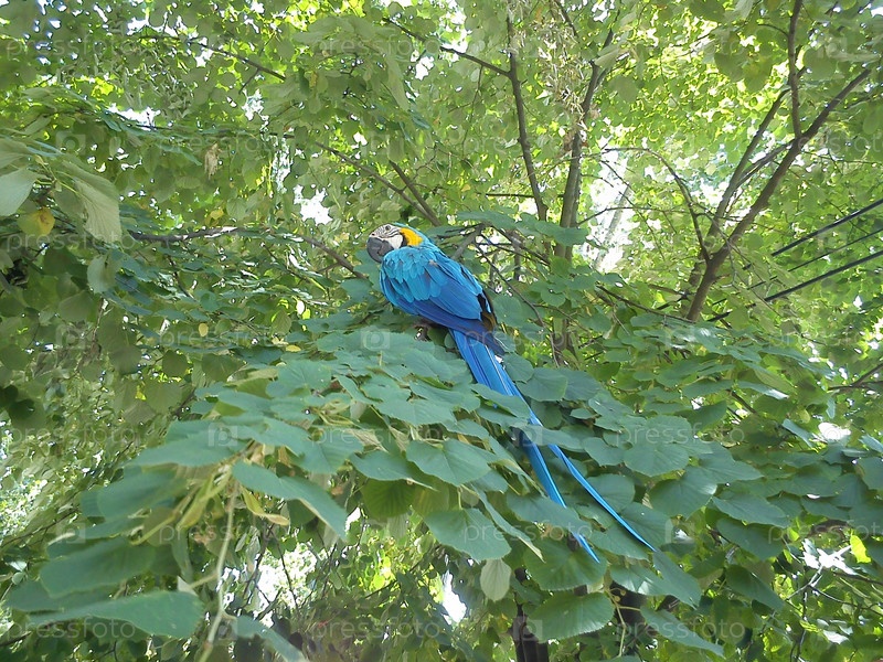 Попугай ара на ветвях деревьев. Птица с сине-золотым оперением в липовой листве. Выгул домашних питомцев на природе или в городском парке. Сремска-Митровица, Сербия