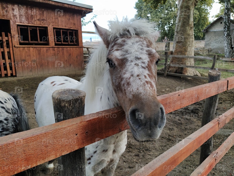 Пони с белой гривой стоит из-за деревянного забора и смотрит в камеру. Животное просит еды
