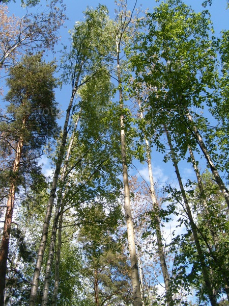 Кроны высоких деревьев в смешанном северном лесу. Скандинавская флора, Карелия, Финляндия. Зеленая листва и полусухие стволы деревьев на фоне голубого безоблачного неба