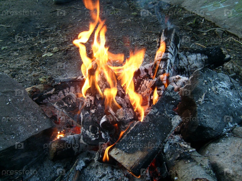 Сжигание дров в костре. Яркий огонь. Языки пламени оранжевого цвета. Большие камни-валуны вокруг костра