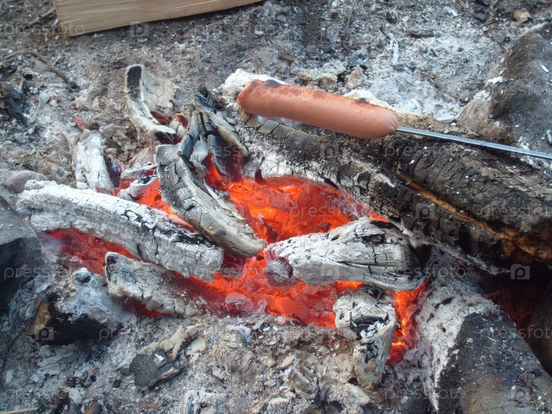 Жареная колбаса на огне. Колбаса, насаженная на шампур. Быстрый ужин в кемпинге за городом. Хот-доги над небольшим костром. Колбаски гриль на костре на свежем воздухе