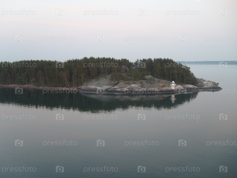 Белые ночи на Балтийском море. Финские шхеры в тумане и ночной дымке. Красивый пейзаж в серо-коричневых тонах. Розовые и голубые цвета неба и воды. Горизонт. Отражение неба в воде