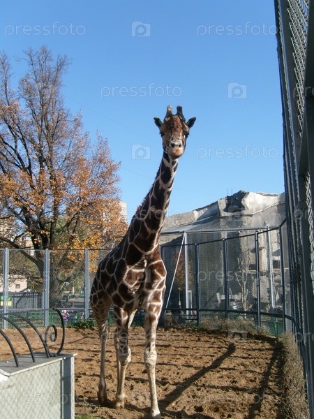 Жираф в Московском зоопарке. Высокое здоровое животное с пятнистой шерстью. Жираф стоит и смотрит на посетителей. Отряд парнокопытные, семейство жирафовых. Голубое небо, ранняя осень