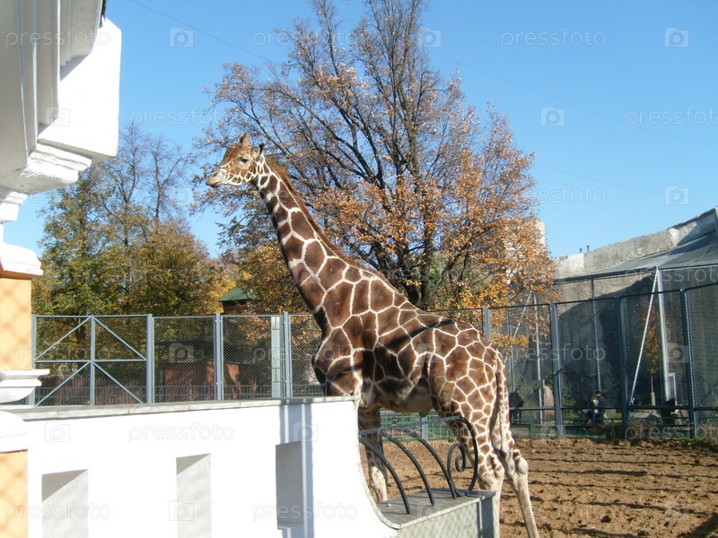 Жираф в Московском зоопарке. Высокое здоровое животное с пятнистой шерстью. Жираф стоит и смотрит на посетителей. Отряд парнокопытные, семейство жирафовых. Голубое небо, ранняя осень