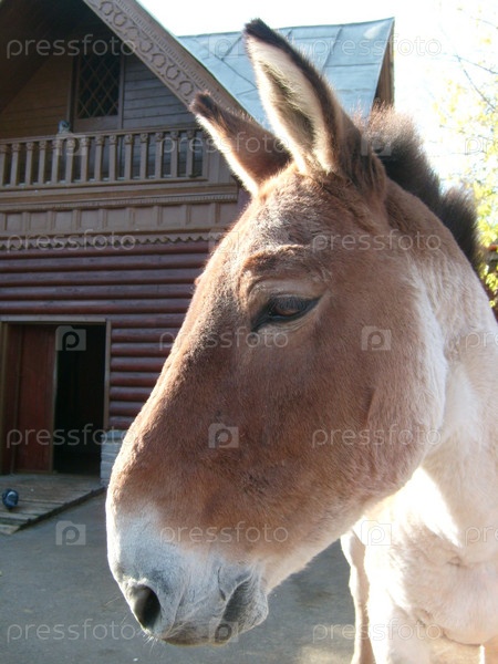 Морда осла в зоопарке или зверинце. Большой нос с ноздрями, глазом и двумя стоячими ушами. Лицо животного