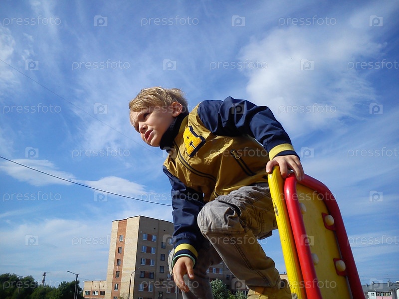 Мальчик на детской площадке. Ребенок со светлыми волосами. Малыш морщит лицо от солнца. Волосы развеваются на ветру. Мальчик готов спрыгнуть с качелей. Нахмурив брови