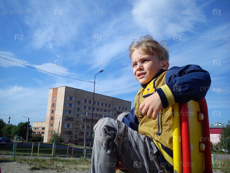 Мальчик на детской площадке. Ребенок со светлыми волосами. Малыш морщит лицо от солнца. Волосы развеваются на ветру. Мальчик сидит на стуле на качелях и смотрит на что-то вдалеке