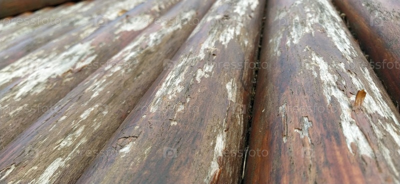Ассортимент круглого леса. Фрагмент конструкции из оцилиндрованных деревянных бревен. Влияние влаги на древесину. Строительный бревно для использования в строительстве без продольной распиловки