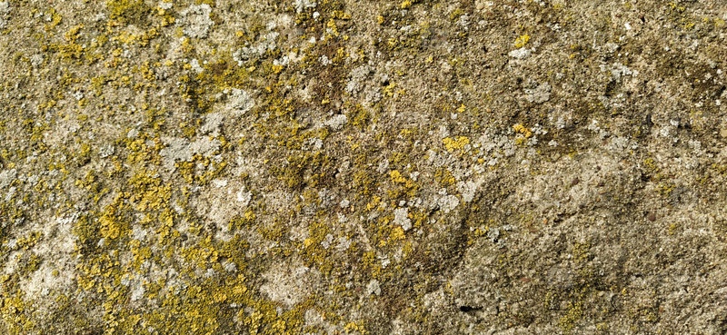 Зеленый мох на каменной текстуре. Мхи и лишайники на камне. Желто-зеленый и серый цвета в качестве фона. Крупный план. Осенние мотивы