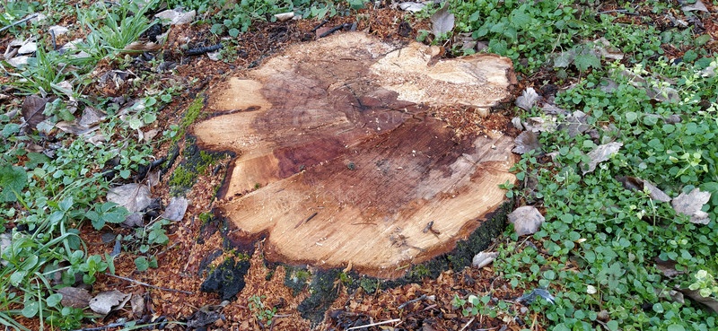 Пень со свежим порезом. Дерево срублено под корень. Крупный план. Годовые кольца на горизонтальной деревянной поверхности. Темная, гнилая середина ствола дерева